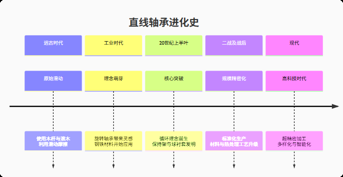 直線軸承的演變,絕非一蹴而就。它是一場跨越千年的接力,其進化歷程可概括為: